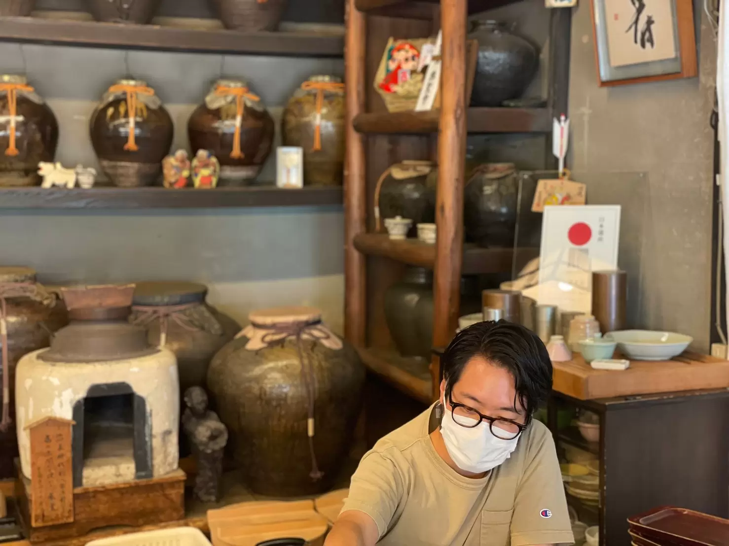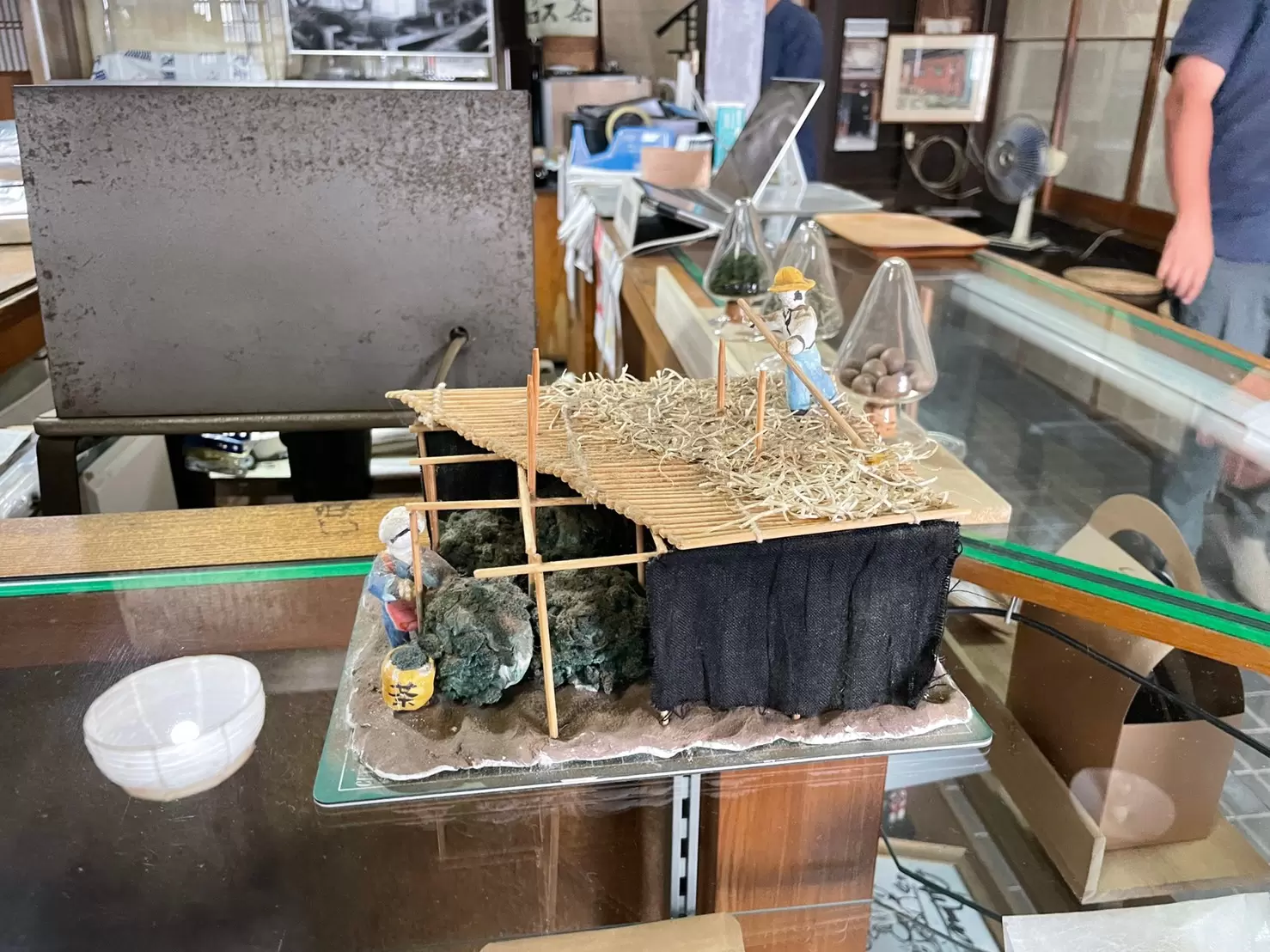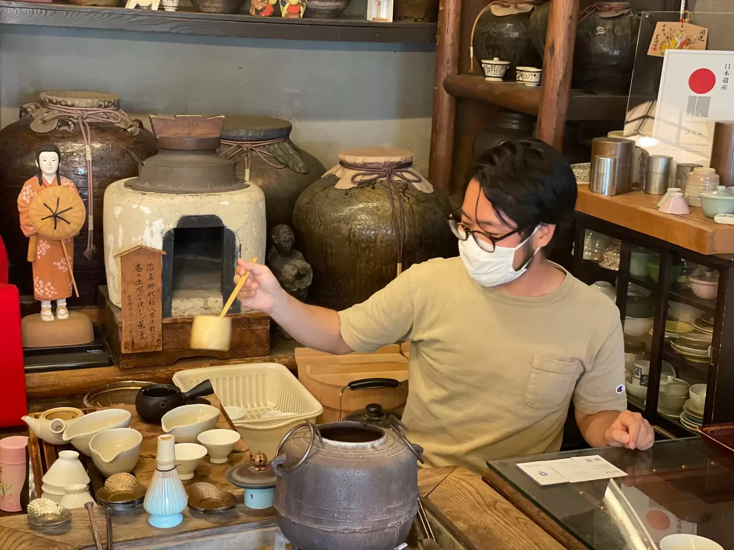 宇治のこの地で24代にも続き、宇治橋を往来する方や旅人にこうしてお茶を淹れておられたのかと思うと…歴史の深さにただただ驚きます。通円さんの後ろにはたくさんの茶つぼがありました。これも何百年も前のものなのでしょう。