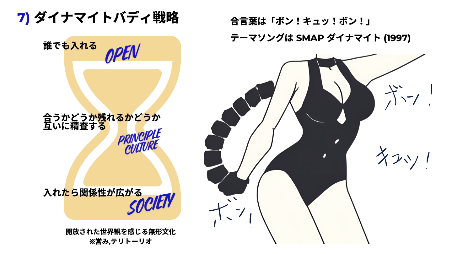 徹生さん:前回出た「ソサエティ」を我々なりに解釈・整理してみたんですね。それがこの資料にある「ダイナマイトバディ戦略」です。誰でも入れる「オープン」さはあるけど、我々が大切にしている「プリンシプル」や「カルチャー」に共感する人が、さらに奥深くに広がるソサエティに入ることができる、というものを表しています。